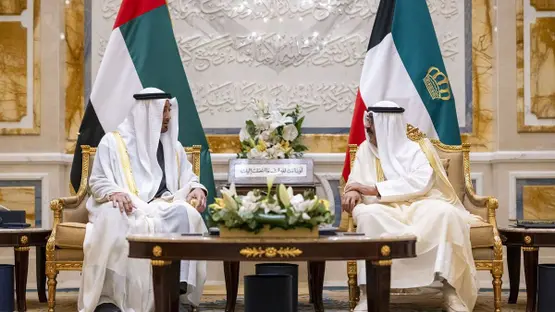 استقبل حضرة صاحب السمو أمير البلاد الشيخ مشعل الأحمد الجابر الصباح حفظه الله ورعاه بقصر بيان ظهر اليوم أخيه صاحب السمو الشيخ محمد بن زايد آل نهيان رئيس دولة الإمارات العربية المتحدة الشقيقة والوفد المرافق لسموه بحضور سمو ولي العهد الشيخ صباح خالد الحمد الصباح حفظه الله وسمو الشيخ أحمد عبدالله الأحمد الصباح رئيس مجلس الوزراء وذلك بمناسبة زيارته الأخوية للبلاد.