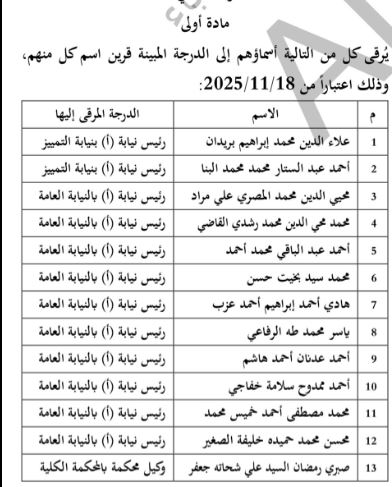 فيما نص المرسوم الثاني رقم 241 لسنة 2025 على ترقية 38 الى رئيس نيابة أ بنيابة التمييز والنيابة العامة ووكيل محكمة بالمحكمة الكلية، ورئيس نيابة ب بنيابة التمييز والنيابة العامة اعتبارا من 18 نوفمبر 2025.